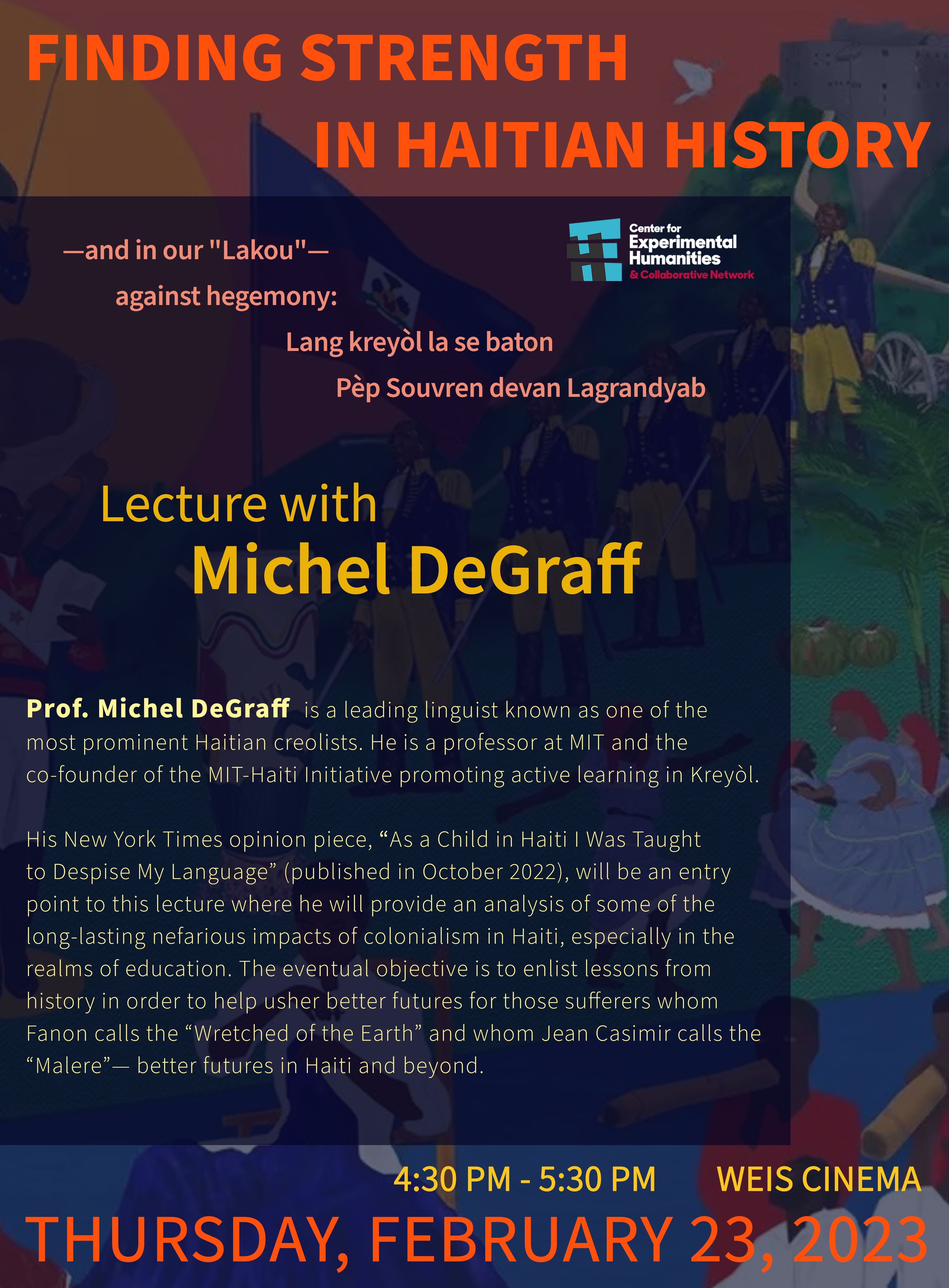Thursday, February 23, 2023 Prof. Michel DeGraff is a leading linguist known as one of the most prominent Haitian creolists. He is a professor at MIT and the founder of the MIT-Haiti Initiative promoting learning of science and technology in Kreyòl. His New York Times opinion piece, "As a Child in Haiti I Was Taught to Despise My Language" (published in October 2022), will be an entry point to this lecture where he will provide an analysis of some of the long-lasting nefarious impact of colonialism in Haiti, especially in the realms of education. The eventual objective is to enlist lessons from history in order to help usher better futures for those sufferers whom Fanon calls the “Wretched of the Earth” and whom Jean Casimir calls the “ Malere ”—better futures in Haiti and beyond. |